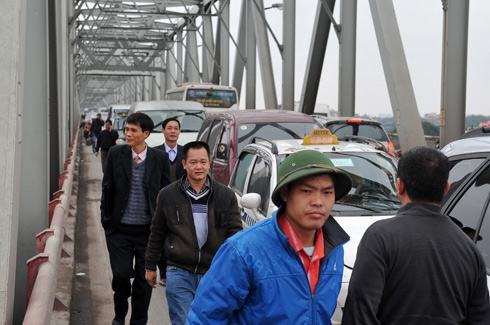 Tắc nghẽn kéo dài đã khiến người phải xuống xe, đi bộ để qua cầu.