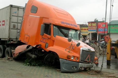 Tại hiện trường, xe rơ-moóc BKS 15C-039.82 chở theo 2 container nằm gục giữa đường, một nửa xe bên phụ “gác” lên vỉa hè. Hai bánh trước gẫy gục, 4 bánh phía sau cày sâu xuống đường.