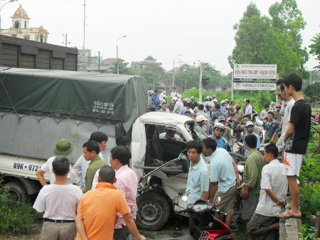 Tàu hỏa chạy từ hướng ga Hà Nội vào TPHCM đâm phải xe tải BKS 89k-9721 qua đường. Xe tải bị văng gần chục mét, ba người ngồi trên xe bị thương nặng.