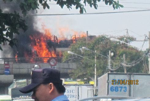 | Xe cháy trên cầu vượt. Ảnh: Hương Giang. |