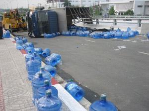 Vụ tai nạn trên xảy ra vào khoảng 13 giờ 15 ngày 6-12, trên cầu vượt Lê Văn Việt, phường Tân Phú, quận 9, TP.HCM. Vào thời điểm trên, xe tải mang BKS: 51C-105.24 chở hàng trăm thùng nước đóng chai (loại 21 lít), lưu thông trên đường nội bộ Khu công nghệ cao hướng từ xa lộ Hà Nội vào. Do phóng nhanh nên vừa lên cầu vượt Lê Văn Việt đã mất lái đâm vào thành cầu bên trái rồi lật nằm ngang giữa đường. Tại hiện trường, các thùng nước nằm vương vãi khắp đường (ảnh). Tài xế chỉ bị thương nhẹ và bỏ đi khi sự cố xảy ra. Do xe tải nằm ngang cầu vượt nên các phương tiện phải lưu thông bằng lộ trình khác.