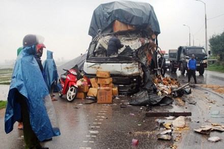 Một cán bộ phòng CSGT Hà Tĩnh cho biết: Khoảng 5h15 ngày 23.12, xe tải mang BKS 18T – 2747, do lái xe Nguyễn Viết Hiển (24 tuổi, trú tại huyện Nam Đàn, tỉnh Nghệ An) điều khiển, chở bột mì, lưu thông hướng nam – bắc đã đâm trực diện vào xe tải mang BKS 76k – 7418, do lái xe tên là Đông (khoảng 30 tuổi trú tại tỉnh Quảng Ngãi) lái, chở bánh kẹo, chạy theo hướng ngược lại.