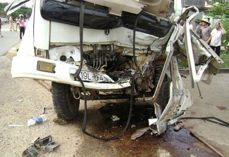 Cú đâm mạnh khiến xe tải nhỏ bắn xa hơn 10 mét, một người ngồi trên buồng lái tử vong.