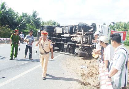 Lúc 9 giờ 25 ngày 8-3, tại chân cầu Cái Cấm trên quốc lộ 60 (xã Tân Thành Bình, huyện Mỏ Cày Bắc, Bến Tre) xảy ra một vụ tai nạn lật xe hi hữu. Anh Trần Thanh Tiến, tài xế xe tải 71N-0767, chở 70 bao gạo (3,5 tấn) đang đổ dốc cầu thì đột ngột hai bánh xe sau nổ tung, khiến xe bị lật ngang.