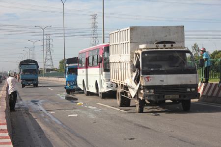 Ngay sau đó, chiếc xe tải do tài xế Nguyễn Bảo Toàn (ngụ Bến Tre) tiếp tục đâm mạnh vào đuôi xe khách.