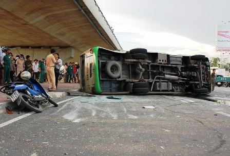 Cú tông khá mạnh khiến chiếc xe khách loạng choạng rồi lao vào lề đường, tông trúng chiếc xe máy và hất văng một lái xe ôm khoảng 2m. Sau sự cố, tài xế xe ôm bất tỉnh ngay tại chỗ. Kết thúc vụ va chạm liên hoàn, chiếc xe khách bị lật ngang đường, phía trong xe ô tô nhiều hành khách bị thương mắc kẹt không thể thoát ra ngoài.