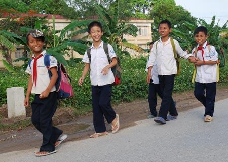 | Học sinh trường tiểu học Đặng Xá kể, mỗi lần đi hoặc tan học, họ đều phải rủ nhau đi theo từng tốp. Ảnh: Hà Anh. |