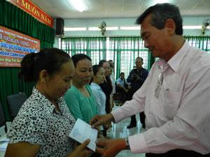 Chủ tịch Công đoàn ngành giáo dục TP Nguyễn Hữu Hùng trao quà Tết cho giáo viên nghèo huyện Cần Giờ ngày 11-2. Ảnh: H.Tr