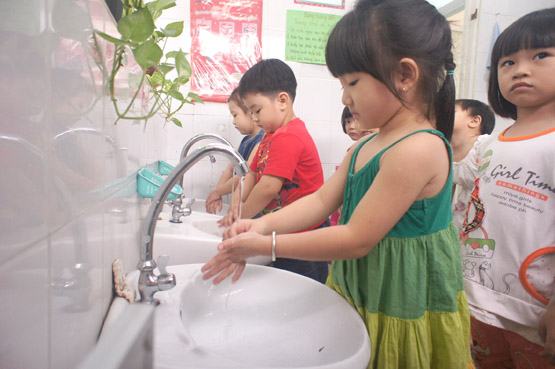 | Các trẻ một trường MN ở Q.5 rửa tay sau khi tham gia trò chơi (ảnh chụp ngày 6-10) |