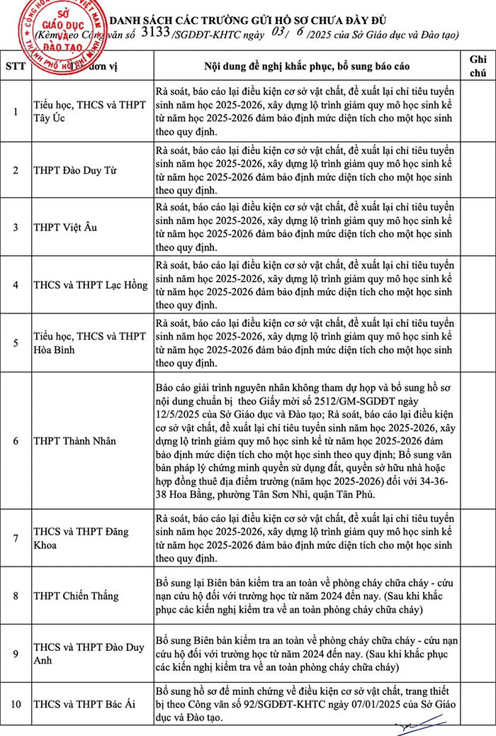 Yêu cầu được lãnh đạo Sở GD-ĐT TP.HCM đưa ra trong công văn gửi đến hiệu trưởng 15 trường THPT ngoài công lập về việc báo cáo khắc phục nội dung xây dựng chỉ tiêu tuyển sinh các lớp đầu cấp năm học 2025-2026 và các năm tiếp theo, ngày 11-6.