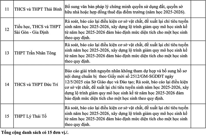 Theo Phó Giám đốc Sở GD-ĐT TP.HCM Dương Trí Dũng, đây là các đơn vị chưa đáp ứng đầy đủ nội dung theo yêu cầu của sở, phục vụ công tác tuyển sinh trong năm học mới thông qua rà soát báo cáo về quy mô học sinh năm học 2025-2026 và các năm tiếp theo của các đơn vị.
