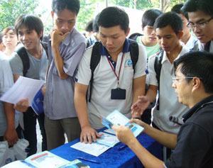 Thông thạo ngoại ngữ giúp sinh viên dễ tiếp cận cơ hội việc làm không chỉ trong nước mà cả quốc tế. Ảnh chụp sinh viên Trường ĐH Bách khoa TP.HCM tìm kiếm việc trong Ngày hội việc làm vừa được tổ chức tại trường